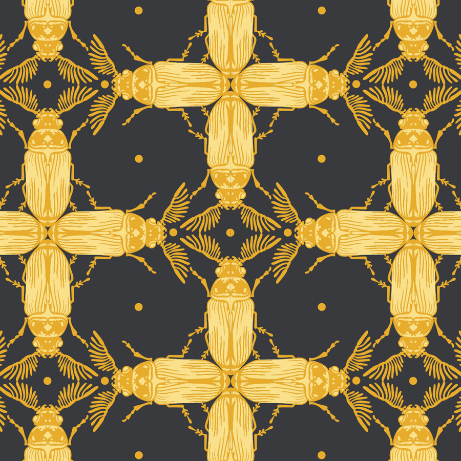 In this surface pattern the golden beetles shine out from the elegantly black background, offering not only a striking colour-way but also a fabulously luxurious mood.